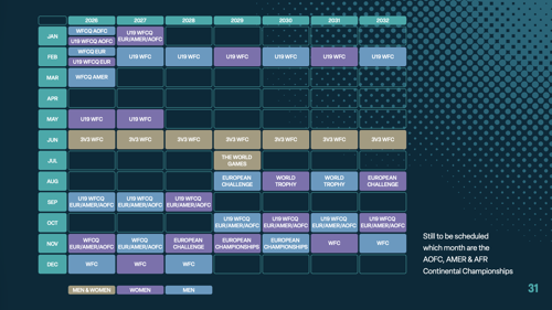 Den nya internationella kalendern och de nya tävlingsformaten kommer att fasas in med start år 2029. Men, för att säkerställa en korrekt övergång kommer det hållas dubbla U19-VM 2027. Det här innebär att det blir två U19-VM på rad för U19-dam- respektive U19-herrlandslaget.
