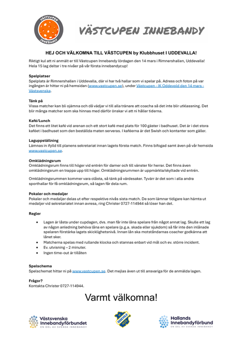 Sista anmälningsdag är den 27 februari. Anmälan görs via formuläret: ANMÄLAN TILL VÄSTCUPEN DEN 14 MARS 2026 – Fyll i formulär