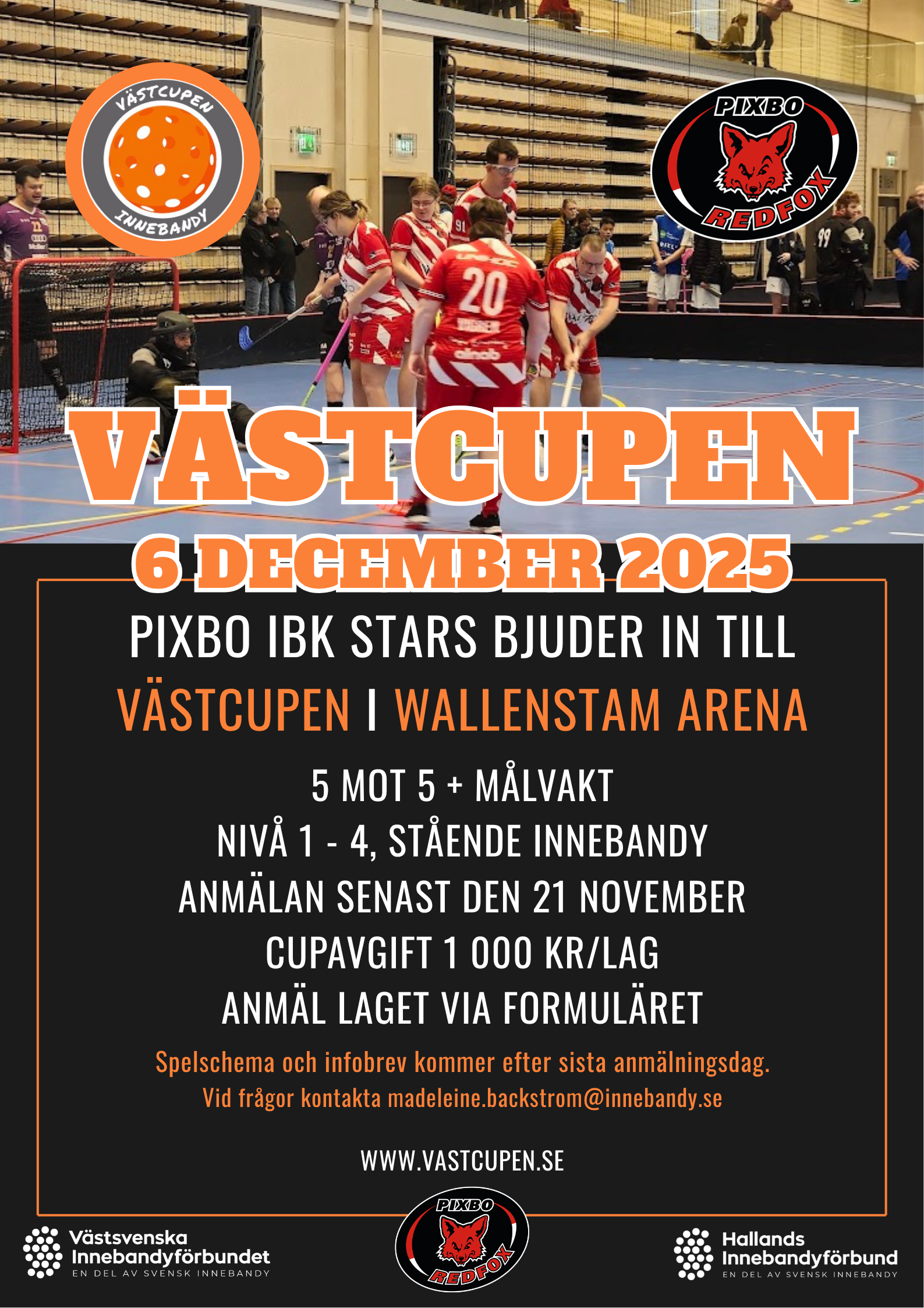 Cupavgiften på 1 000 kr/lag betalas till Pixbo Innebandys bankgironr. 5063-6885. Ange Västcupen