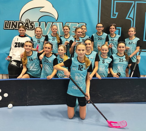 Nellie med sitt innebandylag i Lindås Waves. Foto: Privat